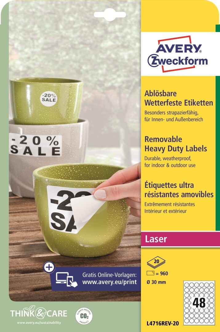 Avery Zweckform L4716REV-20 Snímatelné kulaté odolné PET etikety Ø 30 mm, bílé