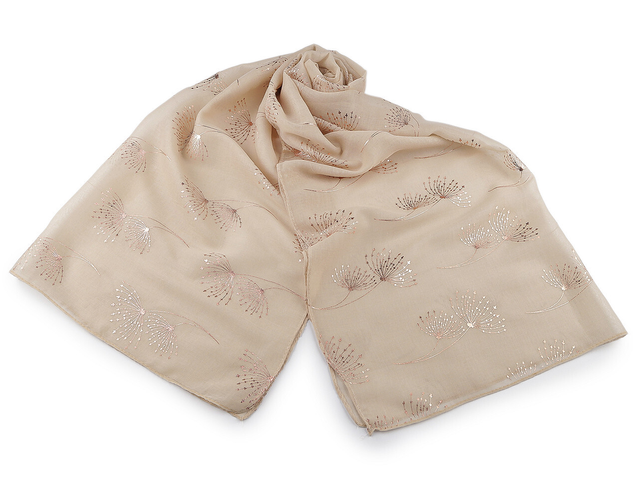 Šátek s metalickým potiskem větviček je velice příjemný na dotek, je vzdušný a lehký. Bude elegantním doplňkem pro každou příležitost, potisk má barvu růžového zlata. Doladí váš outfit, ať už si vezmete sako, halenku, svetřík či šaty. Hodí se k formálním i neformálním outfitům, můžete ho snadno kombinovat s vaším šatníkem.