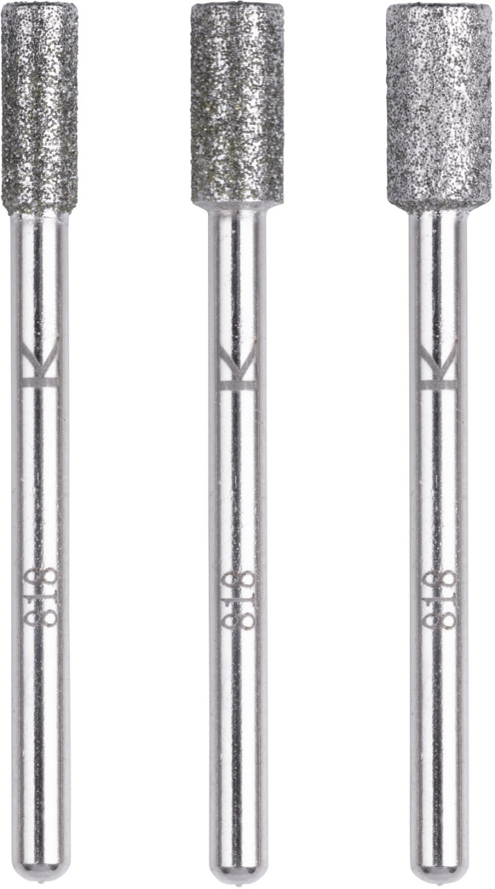 Zestaw kamieni szlifierskich diamentowych, kształt cylindryczny, 3-częściowyDo szlifowania ceramiki, szkła, glazury, metali kolorowych- 3 cylindryczne kamienie szlifierskie diamentowe, Ø 4 / 4,8 / 5,5 - trzpień 3 mm do łatwego mocowania w wiertarkach, wkrętarkach akumulatorowych, wałkach giętkich...