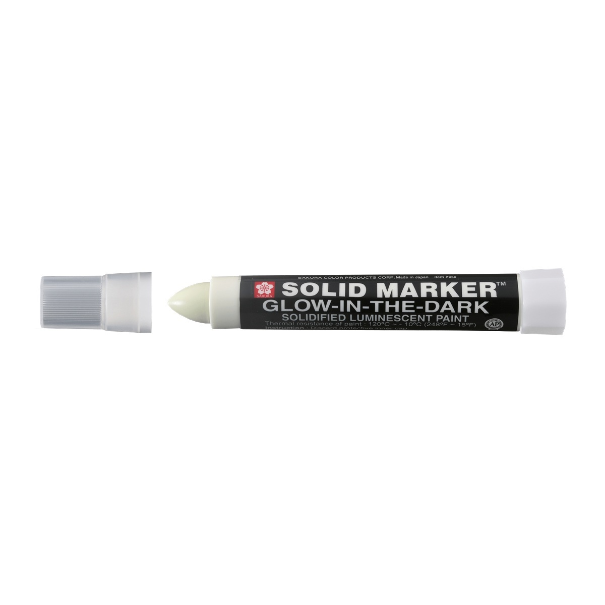 Sakura Solid Marker glow in the darkOpis produktuTa świecąca w ciemności wersja oryginalnego Solid Marker jest pierwszym tego typu markerem, który zawiera bezpieczny materiał fotoluminescencyjny, umożliwiający łatwe świecenie w ciemności. Po naświetleniu znaki będą świecić do 30 minut dzięki...