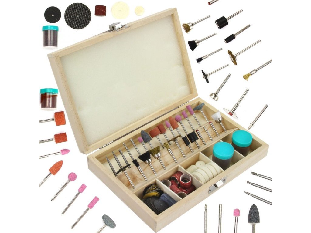 Sada na stopce 3 mm různých typů fréz, vrtáků, disků, kartáčů pro frézování, vrtání a řezání. Včetně lešticí pasty.