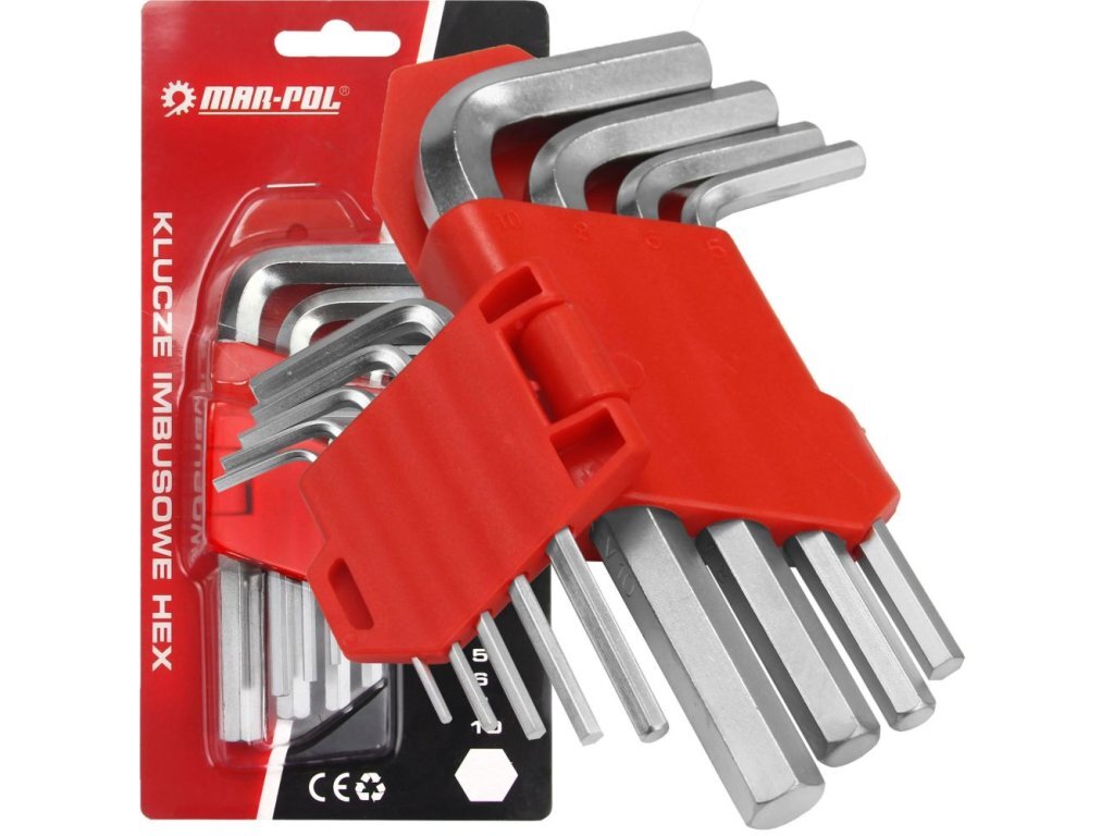 Imbusové klíče 9ks krátké (M66433) MAR-POLKvalitní imbusové klíče jsou vyrobeny z CrV oceli, která zajišťuje vynikající kvalitu a dlouhou životnost klíčů.Ideální sada oboustranných klíčů typu L (HEX) pro práci na těžko dostupných místech. Sada je vložena do praktického plastového věšáku, na...