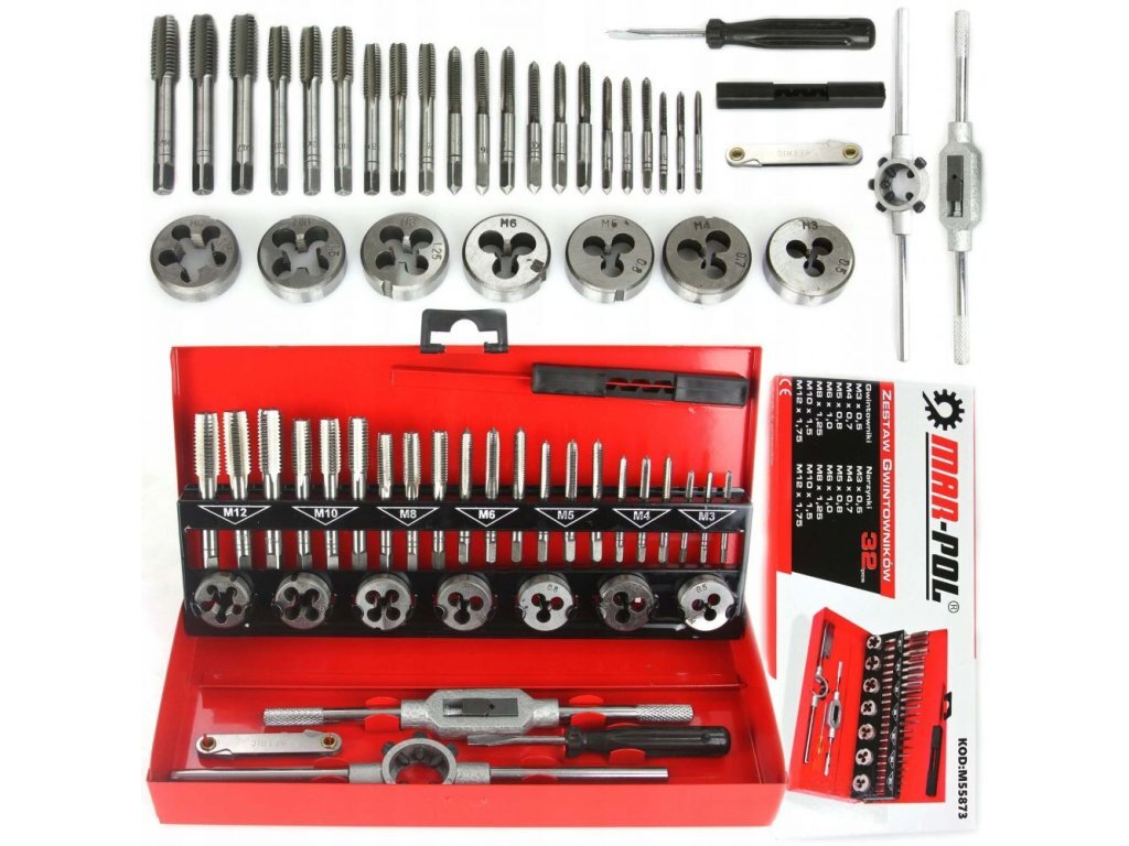 Sada závitníků a závitových oček 32ks MAR-POL32-dílná sada metrických závitníků a závitových oček pro ruční závitování pomocí vratidla. Vyrobeno z kvalitní tvrzené oceli. Sada se používá k opravě jakéhokoli typu závitového spoje u většiny materiálů. Najde uplatnění v každé dílně a garáži....
