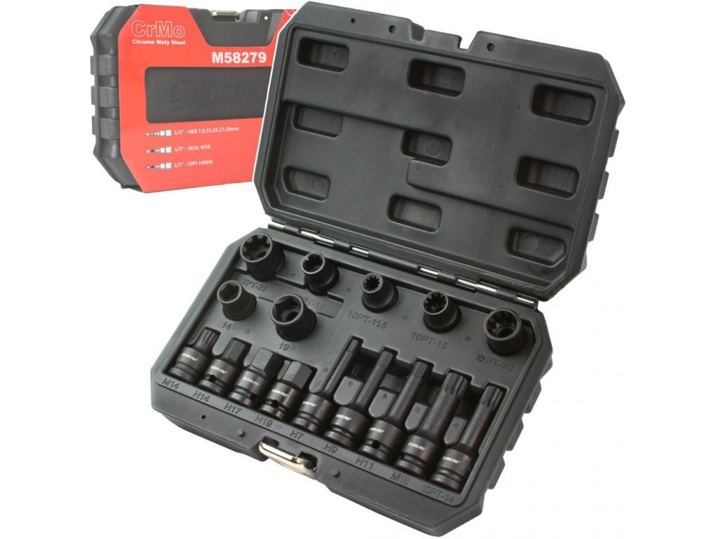 Sada hlavic 1/2" na brzdové třmeny. Nástrčné a zástrčné hlavice v sadě 16 ks.