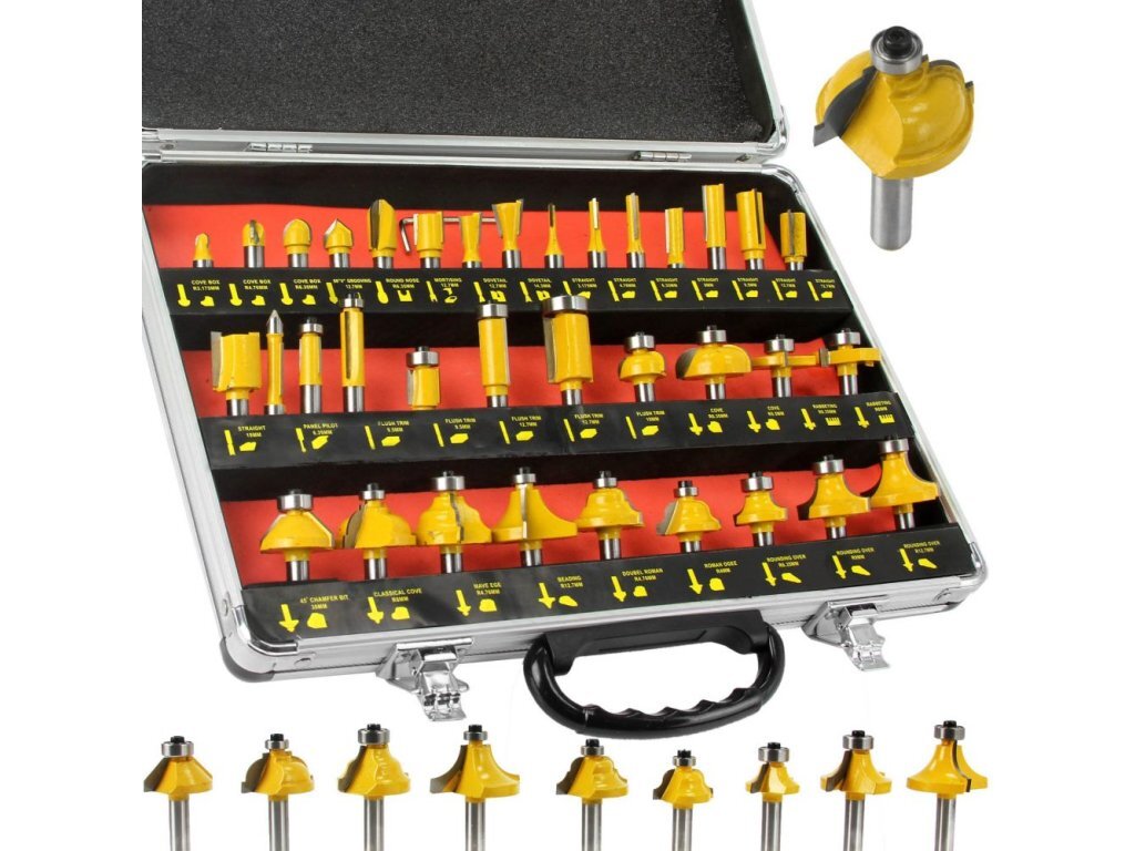 Sada 35 stopkových fréz MAR-POL s tvrdokovovými destičkami. Vhodné pro dřevo, 18 fréz s ložiskem, stopka 8 mm. Uloženo v praktickém kufru.