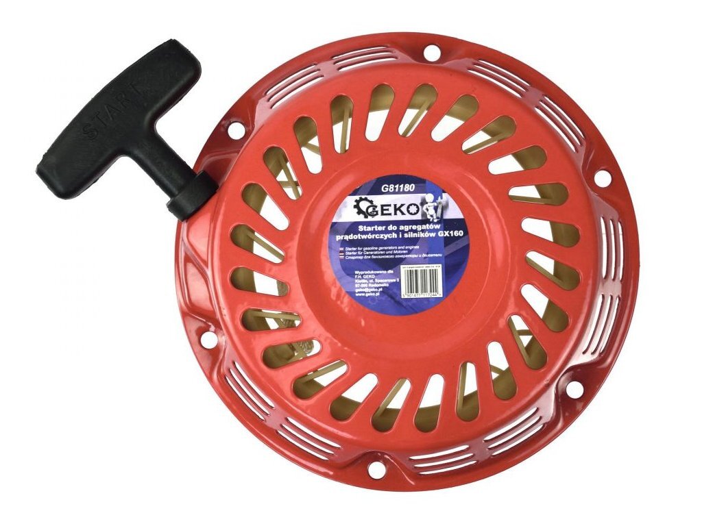 Startér k motoru GX160 GEKONový náhradní startér pro většinu čtyřtaktních benzinových motorů, pasuje do většiny strojů a zařízení např. do motorů Honda (GX160) a jiné.. Nejčastěji se používají v generátorech, vibračních deskách, čerpadlech, frézách...celkový průměr startéru cca 175mmupevnění...