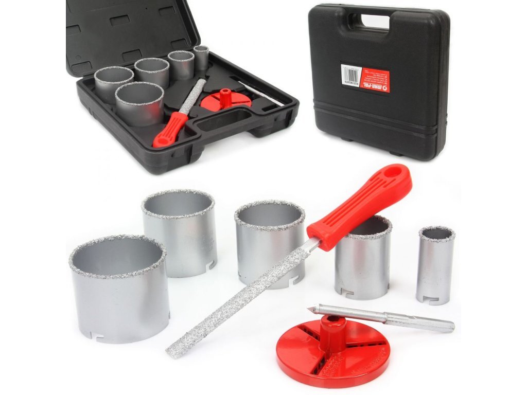 Sada nezbytná pro dokončovací, instalatérské a elektroinstalační práce. Sada obsahuje pilník pro broušení všech zbývajících nerovností, např. po vrtání do dlaždic. Wolframová vrstva zajišťuje vysokou účinnost. Korunky jsou vhodné pro jakýkoliv druh vrtačky.