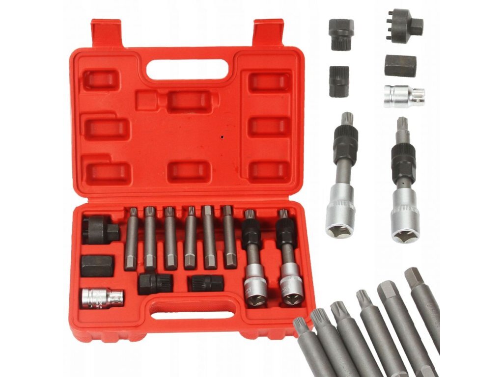 Sada klíčů 13ks na demontáž řemenic alternátorůSada klíčů pro montáž a demontáž alternátorů. Bity jsou vyrobeny z CrV chrom-vanadiové oceli. Klíče umožňují současné vyšroubování upevňovacího šroubu řemenice (pomocí vhodného bitu) a přidržení řemenice se spojkou pomocí speciálního násadky. - pro...