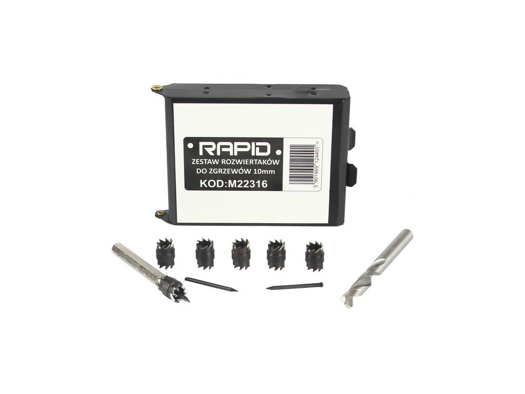 Frézky na bodové svary sada 10 ks RAPIDSada je určena k odstraňování bodových svarů, spojů karoserií automobilů.Jedná se o výstružník na svary s oboustrannými korunkovými frézami, vodícím hrotem a držákem 6-hran. Sada obsahuje:Oboustranné korunkové frézy: 6 ks Vyměnitelné vodíci hroty: 3 ks...