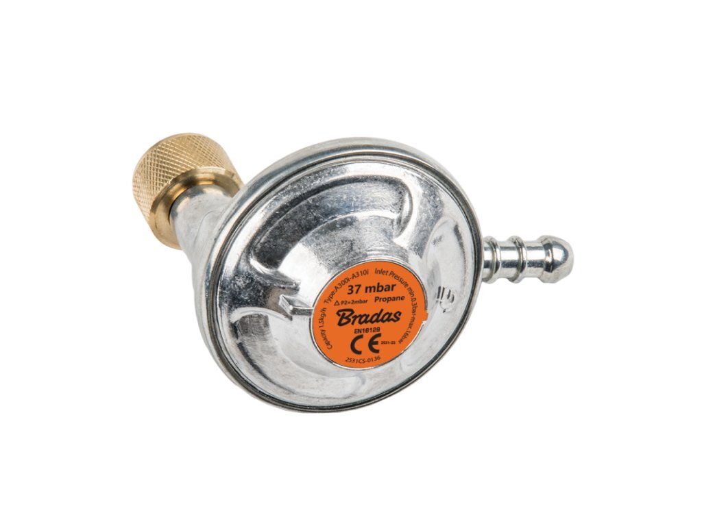 Úhlový regulátor tlaku plynu 37mbar, 1,5kg/h na turistické láhve s trnem