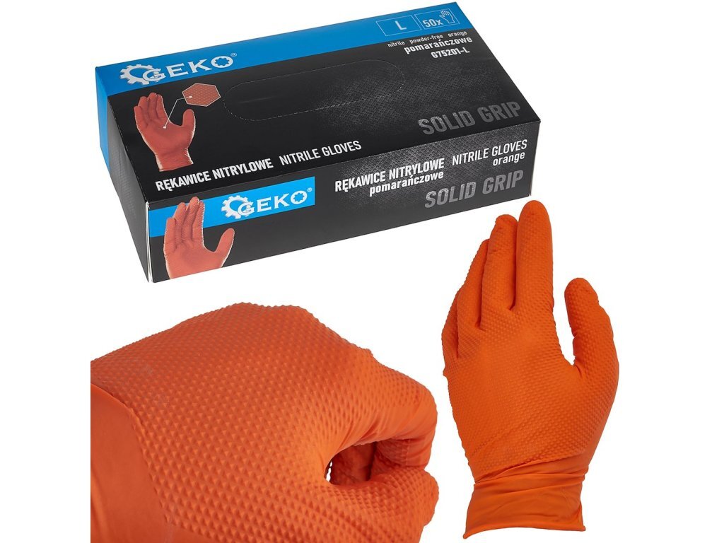 Nitrilové rukavice Solid Grip 3D, pevné, odolné chemikáliím, 50 ks, oranžové, velikost L - GEKONitrilové rukavice G75201 v černé barvě s diamantovou texturou, která zajišťuje vynikající úchop a ochranu rukou při práci v náročném prostředí. 3D diamantová textura zároveň umožňuje cirkulaci vzduchu...