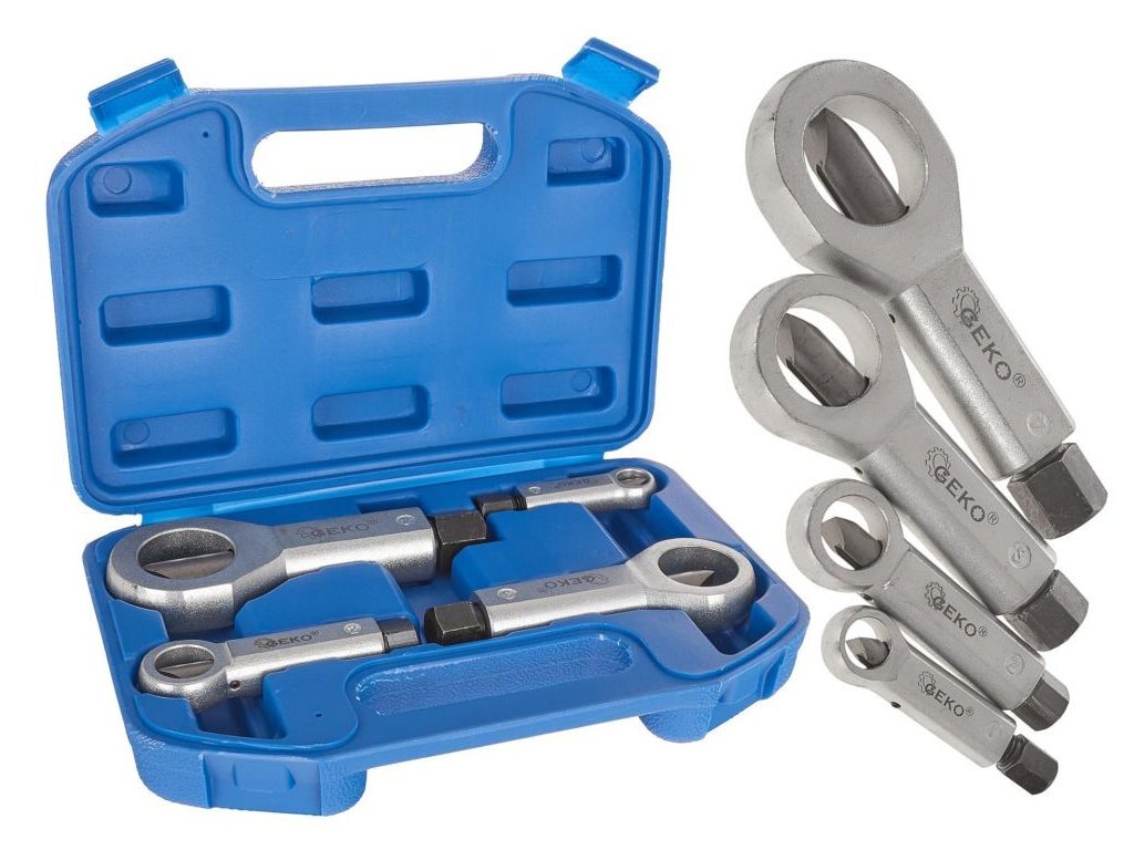 Stříhače poškozených matic, sada 4ks GEKOSada stříhačů je určena pro snadné a rychlé odstranění zrezivělých nebo poškozených matic, které nejdou povolit standartním klíčem. Otáčením vodicího šestihranu čepel stříhače postupně rozevírá poškozenou matici až do úplného rozevření...