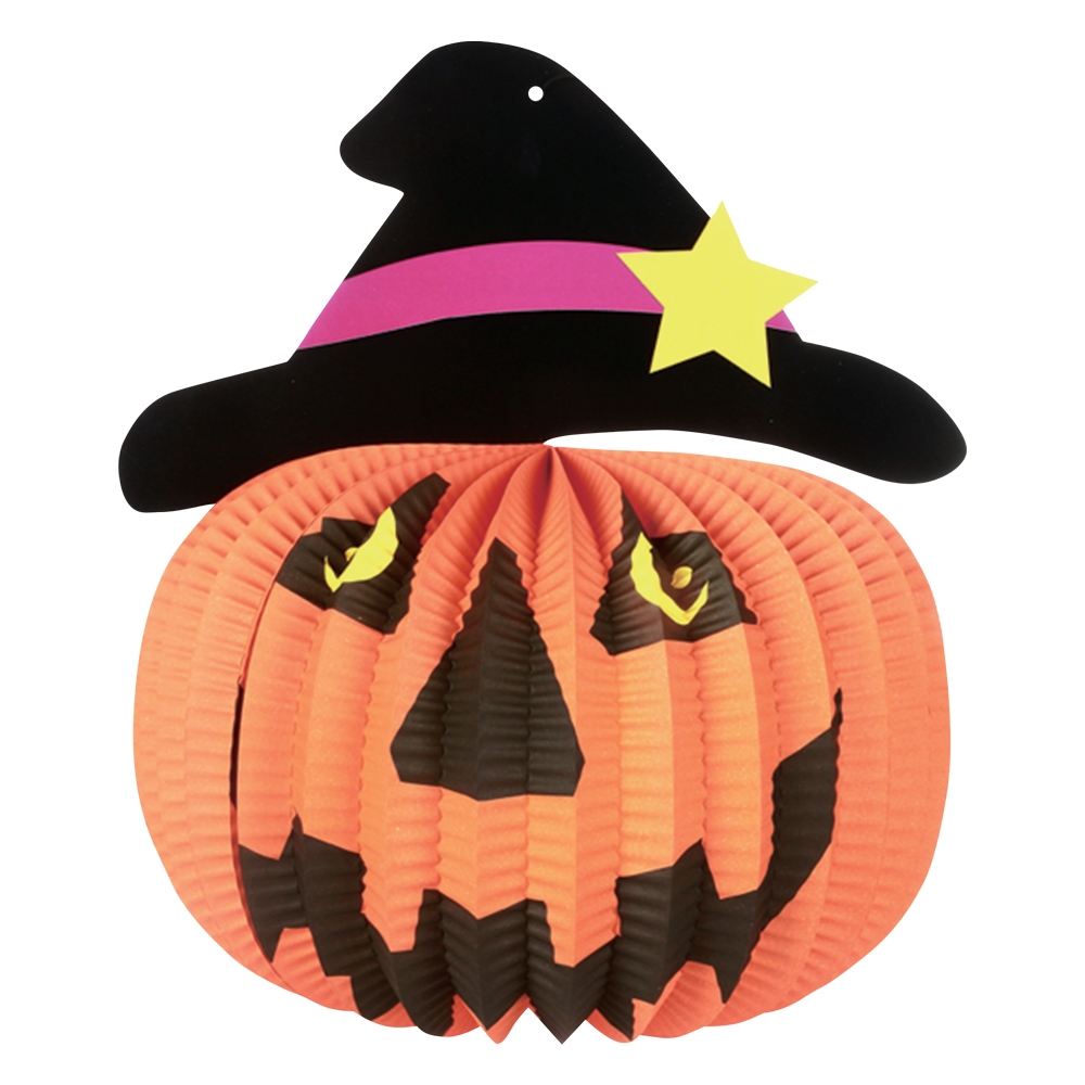 Lampion Dýně s kloboukem, papírový, kulatý, 26 cm, očko k zavěšení. Použití: dekorační účely, večírky a karnevaly. Upozornění: Nevhodné pro děti do 3 let. Není to hračka. Doporučuje se dohled dospělé osoby. Riziko vznícení a popálení. Držák na lampion není součástí balení.