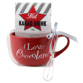 Dárková sada, Čokoláda 19 g, červený keramický hrnek s nápisem, 500 ml, metlička