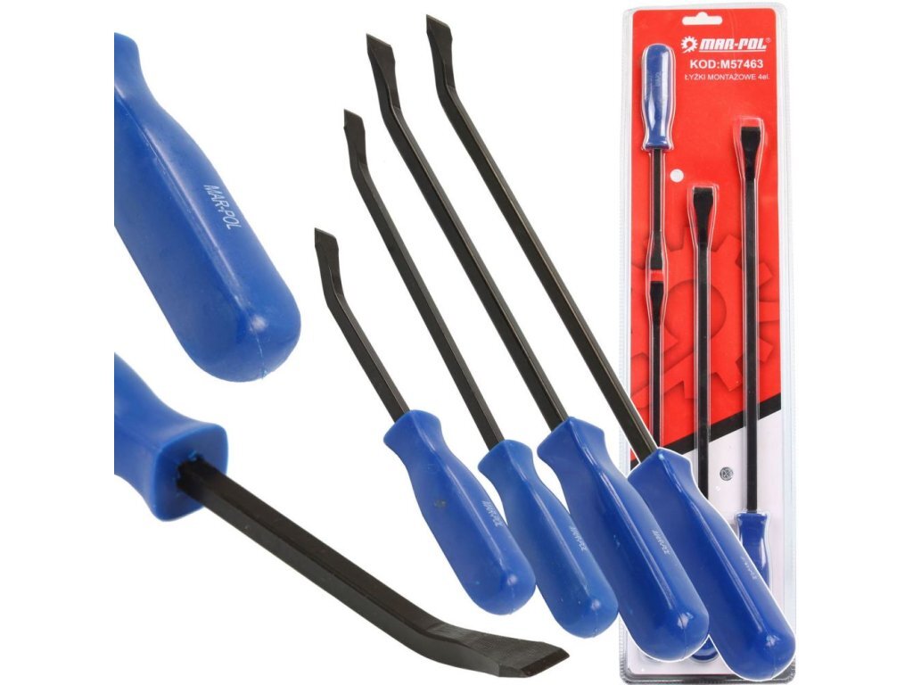 Montážní páky pro páčení, sada 4ks MAR-POLMontážní páky pro páčení jsou vyrobeny z vysoce kvalitních materiálů. Díky čtyřem různým velikostem je tato sada univerzální. Tvarované rukojeti pokryté odolným plastem pro správné uchopení. Slouží k demontáži, páčení, ohýbání nebo montáži.Účel...