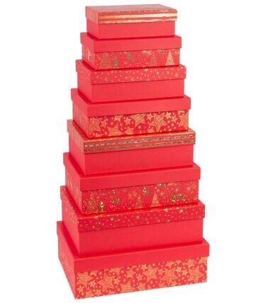 Sada dárkových krabic.Rozměry: 14,5 x 10 x 5 cm; 17 x 12 x 5,5 cm; 9 x 13,5 x 6 cm; 22 x 16 x 6,5 cm; 24,5 x 17,5 x 7 cm; 27,5 x 19,5 x 7,5 cm; 29 x 21 x 8 cm; 33 x 23.5 x 9 cm; 35 x 25 x 10 cm; 37 x 27 x 13 cm prečítať celé