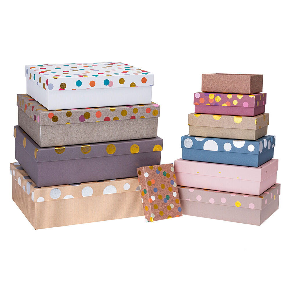 Sada dárkových krabic.Rozměry: 14,5 x 10 x 5 cm; 17 x 12 x 5,5 cm; 9 x 13,5 x 6 cm; 22 x 16 x 6,5 cm; 24,5 x 17,5 x 7 cm; 27,5 x 19,5 x 7,5 cm; 29 x 21 x 8 cm; 33 x 23.5 x 9 cm; 35 x 25 x 10 cm; 37 x 27 x 13 cm prečítať celé