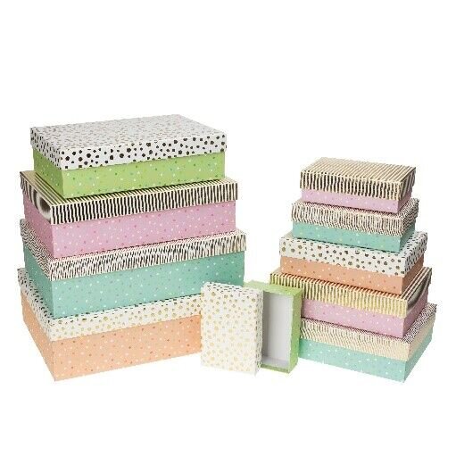 Sada dárkových krabic.Rozměry: 14,5 x 10 x 5 cm; 17 x 12 x 5,5 cm; 9 x 13,5 x 6 cm; 22 x 16 x 6,5 cm; 24,5 x 17,5 x 7 cm; 27,5 x 19,5 x 7,5 cm; 29 x 21 x 8 cm; 33 x 23.5 x 9 cm; 35 x 25 x 10 cm; 37 x 27 x 13 cm prečítať celé