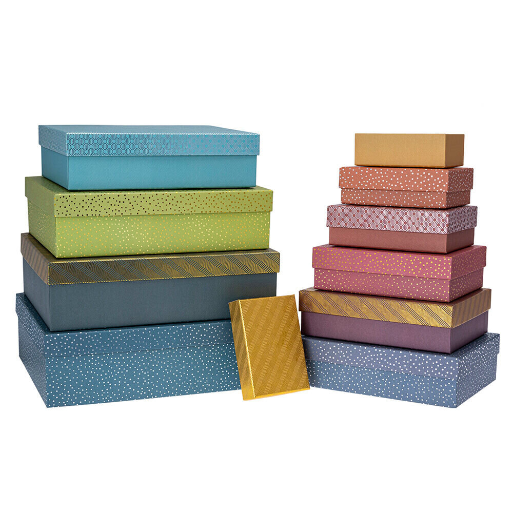 Sada dárkových krabic.Rozměry: 14,5 x 10 x 5 cm; 17 x 12 x 5,5 cm; 9 x 13,5 x 6 cm; 22 x 16 x 6,5 cm; 24,5 x 17,5 x 7 cm; 27,5 x 19,5 x 7,5 cm; 29 x 21 x 8 cm; 33 x 23.5 x 9 cm; 35 x 25 x 10 cm; 37 x 27 x 13 cm prečítať celé