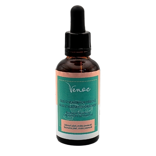 Olej z vlašských ořechů Venoc 50mlOlej z vlašských ořechů Venoc je 100% organický, za studena lisovaný olej, který je bohatý na nenasycené mastné kyseliny, zejména omega-3 a omega-6, a obsahuje vysoké množství vitaminů B, E a minerálů jako hořčík, zinek a draslík. Díky svým vyživujícím a...