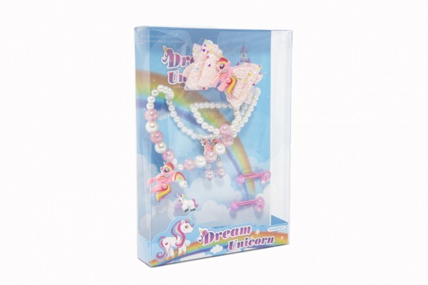 Nádherné šperky v podobě náhrdelníku a náramku pro všechny malé parádnice. Součástí balení je také barevně laděná sponka do vlasů, náušnice, prstýnky, gumičky do vlasů a to vše s motivy jednorožce. Celý set je také vhodným doplňkem ke karnevalovému kostýmu. Baleno v krabičce.