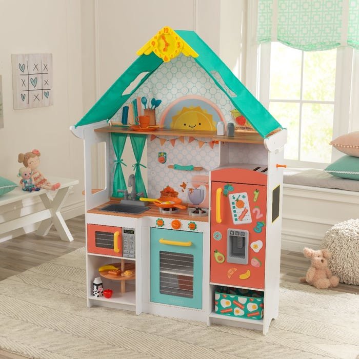 Až děti uvidí tuto kuchyňku, jistě jim vykouzlí úsměv na tváři. Veselé barvy a moderní design dodají hračce dojem hybridu mezi domečkem a kuchyňkou. Textilní stříška s dvěma střešními okny, hodiny s pohyblivými ručičkami, na kterých si mohou nastavit svůj čas na hru. Malí šéfkuchaři se v kuchyňce...