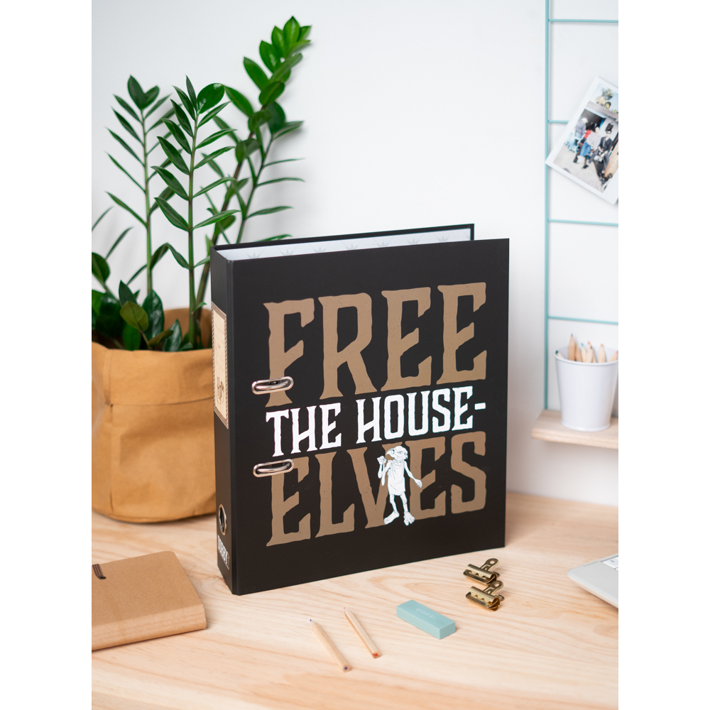 2 kroužkový pořadač inspirovaný skřítkem Dobbym a nápisem "Free The House-Elves". Pořadač má stahovací pásek, který slouží proti nechtěnému otevření.