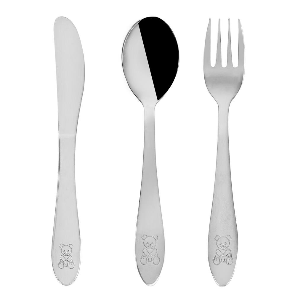 Dětský příbor s dekorem medvídka. Obsahuje 3 ks - lžíci, vidličku a nůž. Materiál: kvalitní nerez. Tvar přizpůsobený dětem. Lze mýt v myčce na nádobí. Rozměry: (délka/šířka) lžíce 15,5/3,5 cm, vidlička 15,5/2,5 cm, nůž 17/2 cm. prečítať celé