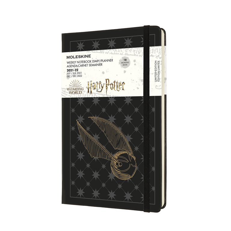 Velký 18 měsíční plánovací zápisník z limitované edice Harry Potter. Diář je datovaný od července 2021 do konce roku 2022. Na levé straně jsou dny v týdnu a na pravé linkovaná stránka na poznámky. Diář má pevnou vazbu v kartonových deskách. Obepíná ho pružná páska proti samovolnému otevírání. Obsahuje praktickou vnitřní kapsu, textilní záložku a tematické samolepky. Papír s gramáží 70 g/m2 neobsahuje kyseliny.