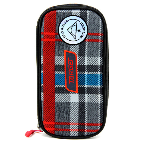 Školní penál bez náplně Target Compact Geo, s pravítkem, kostkovaný, červeno-modro-šedý