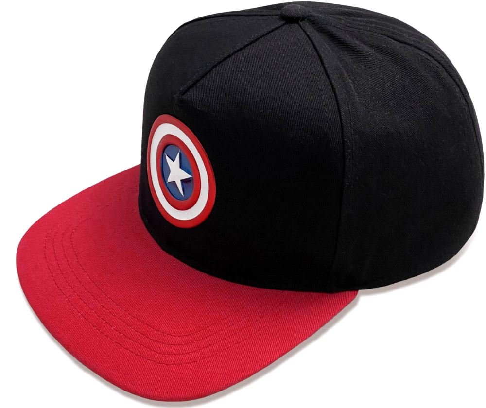 Atraktivní černo-červená kšiltovka inspirovaná postavou superhrdiny Captain America a jeho logem.
