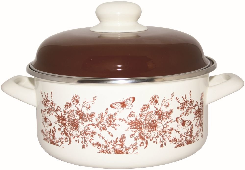 Smaltovaný hrnec o objemu 1,5 l s poklicí, s motivem květin a motýlů. Hrnec je vhodný na všechny typy varných ploch včetně indukce. Lze jej mýt v myčce nádobí. Barva - smetanově bílá s hnědým motivem, poklička - hnědá. Materiál - smalt. Rozměry - výška 8 cm, průměr 16 cm.