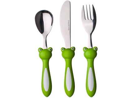 Táto 3-dielna sada obsahuje jedálsku lyžicu (15,5 cm), jedálsky nôž (17,5 cm) a jedálsku vidličku (16,3 cm), ktoré majú plastové rukoväte s motívom žabky. Príbory sú ergonomicky tvarované a prispôsobené detskej ruke, čo uľahčuje ich držanie a manipuláciu a pomôže deťom osvojiť si správne návyky pri stravovaní.