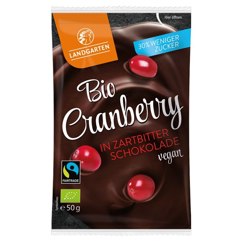 Landgarten Bio brusinky v jemně hořké čokoládě, 50 g