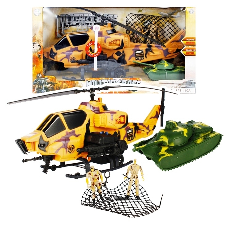 Vojenský vrtulník na baterie s vojáky a tankem - světlo, zvuk
