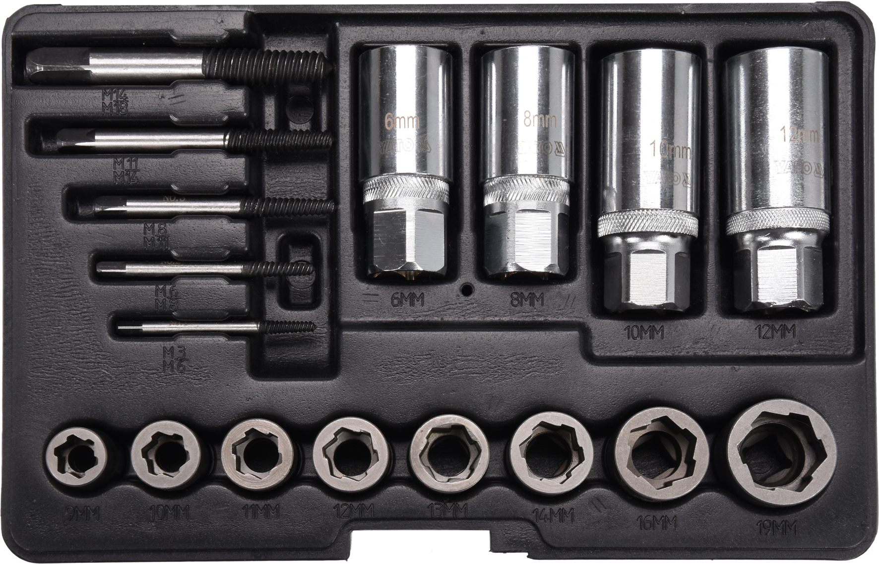 Univerzální 17dílná sada vytahováků šroubů a nástrčných klíčů. Doporučeno pro mechanické a automobilové služby.