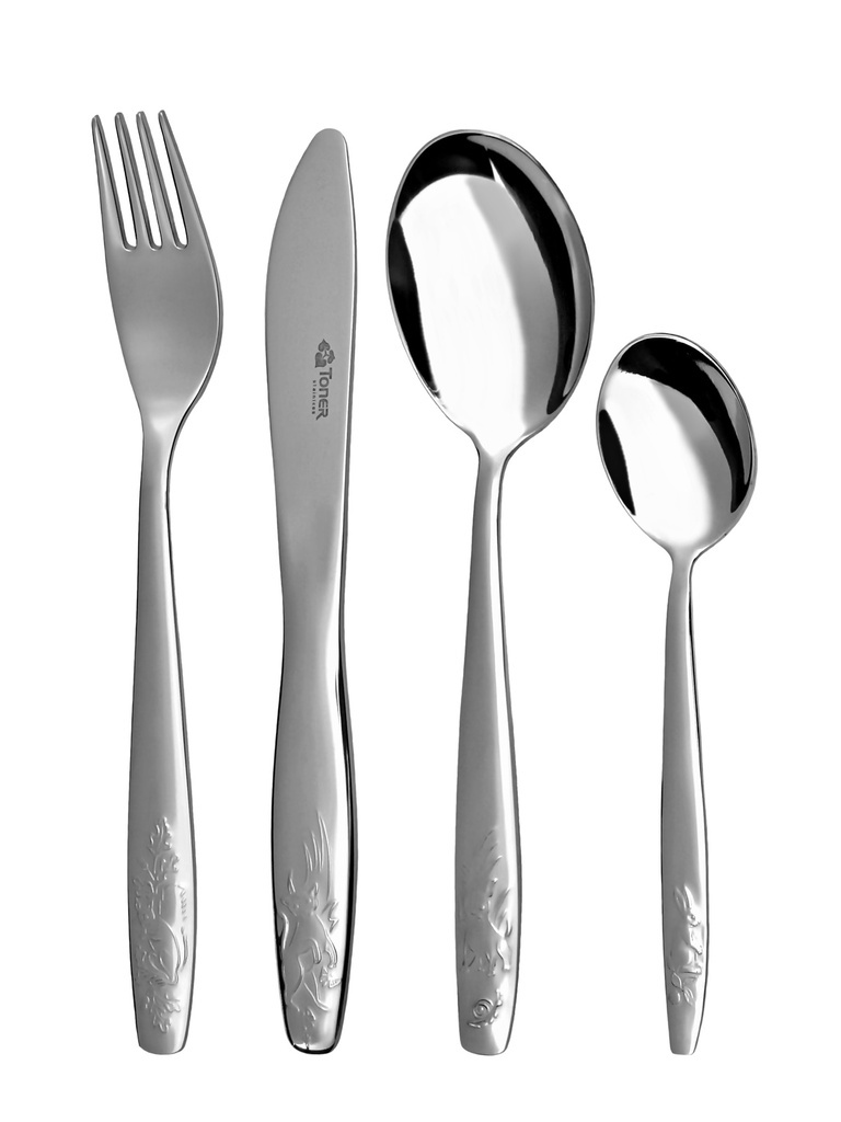 Dětský jídelní 4 dílný příbor BABY v dárkovém balení. Sada obsahuje - 1x polévková lžíce, 1x vidlička, 1x nůž, 1x čajová lžička. Mechanicky leštěno do vysokého lesku. Příbory jsou vhodné do myčky nádobí.