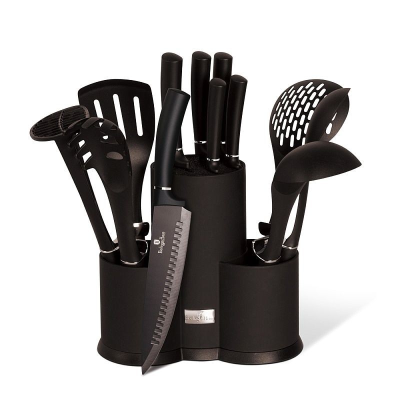 - dokonale praktická sada celkem 12ti kusů kuchyňského vybavení a nožů ve stojanu