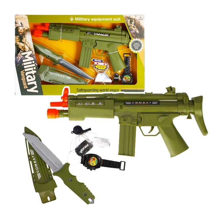 Posuvná zvuková pistole, puška má zvukové a světelné efekty, při výstřelu vibruje. Kompletní sada pro každého mladého vojáka. Každé dítě se nyní může cítit jako skutečný voják jedoucí do války. Obsah soupravy: puška, nůž, hodinky, přívěsek. Souprava je vyrobena z plastu. Rozměry produktu (délka x...