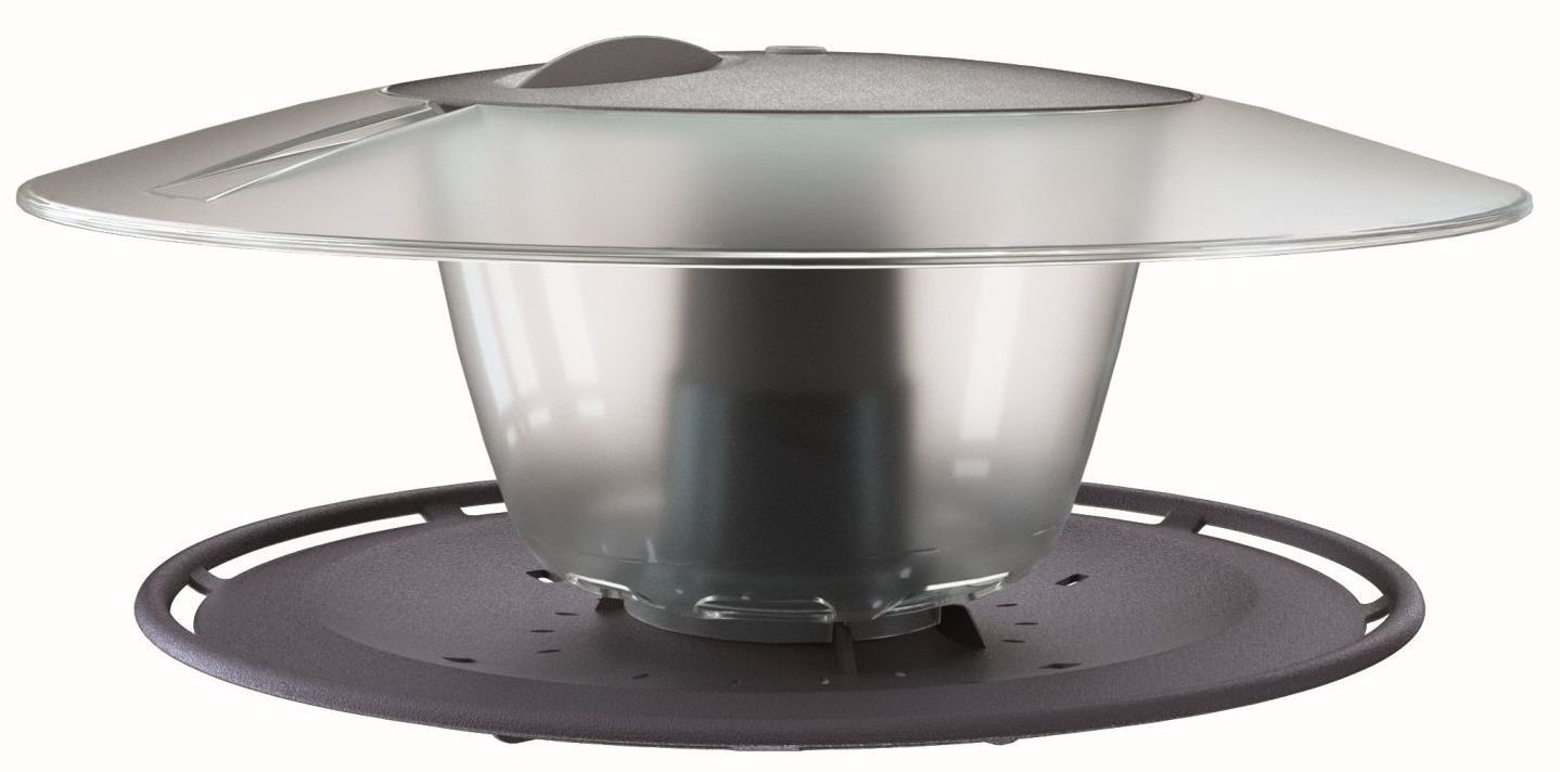 Krmítko s velkou nádobou na různě velké zrno. Šikmá, kulatá stříška chrání krmení před deštěm a sněhem.