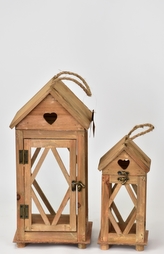 Dřevěná lucerna domek se srdíčkem, hnědá s patinou, sada 2 ks