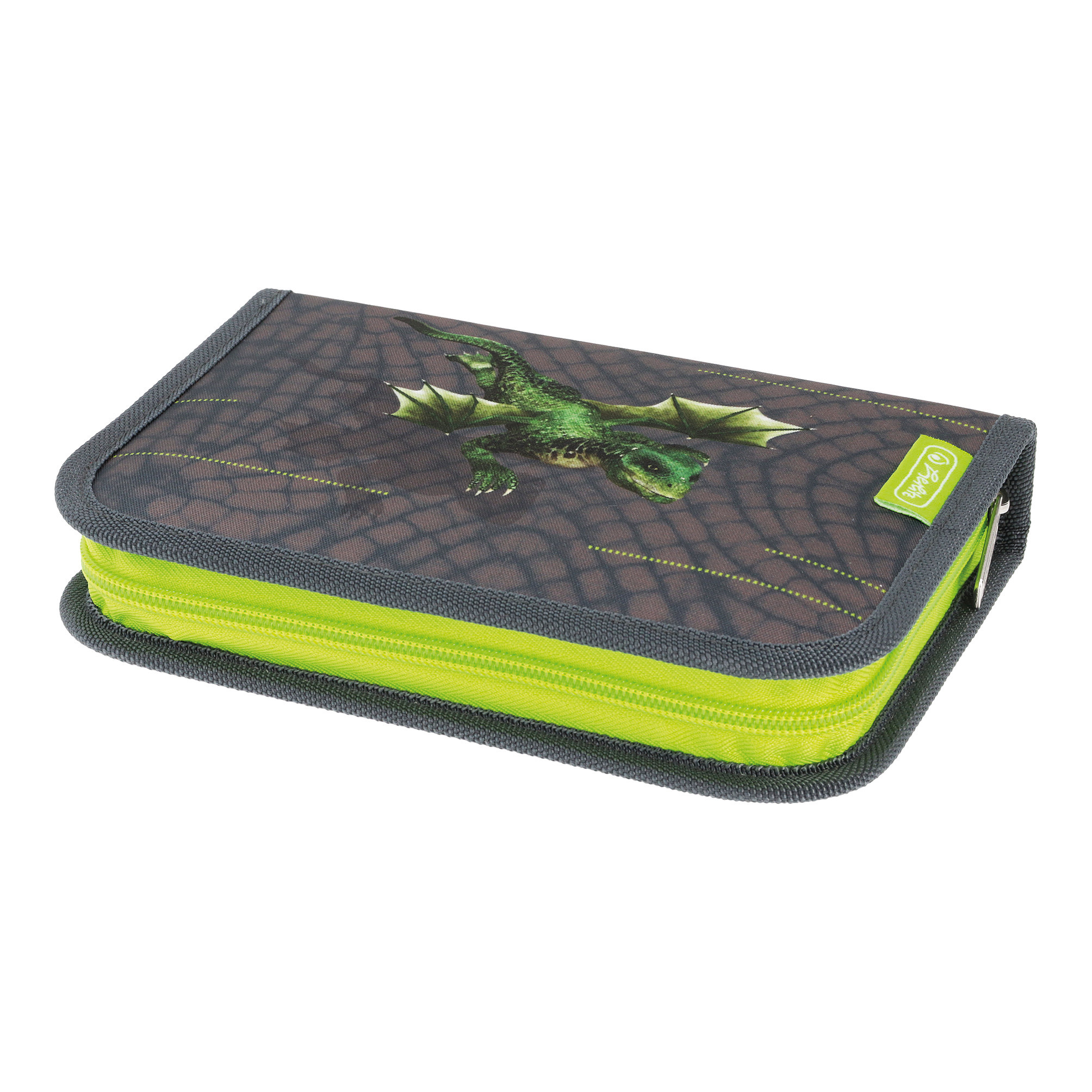 chlopně, drak, 20,3 x 14 x 3,5 cm, 31 dílů - 14 fixů, 8 šestihranných pastelek, 2 tužky, ořezávátko, guma, 16 cm pravítko, trojúhelník, kuličkové pero, rozvrh hodin, vizitka, materiál: polyester prečítať celé
