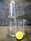 Materiál - sklo. Rozměry - karafa: výška 25 cm, průměr 9,5 cm; sklenka: výška 11,5 cm, průměr 7,5 cm.