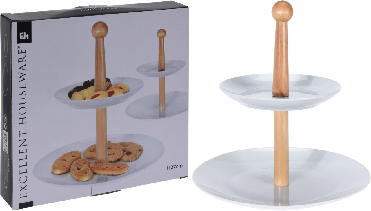 Dvoupatrový etažér je složený ze dvou porcelánových talířů a dřevěného stojánku.Materiál: porcelán, dřevoRozměry:výška 24 cmprůměr spodního talíře 24 cm prečítať celé