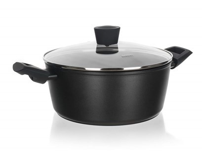 Hliníkový kovaný hrnec GRAZIA o rozměru 24 x 10,5 cm se skleněnou poklicí, se značkovým nepřílnavým 3vrstvým povrchem ILAG PREMIUM, s vnějším 2vrstvým žáruvzdorným nástřikem, barva černý mat, tl. stěny 3,0 mm, indukční dno s piktogramovým laserovým potiskem, knob a ucha se soft touch povrchovou...