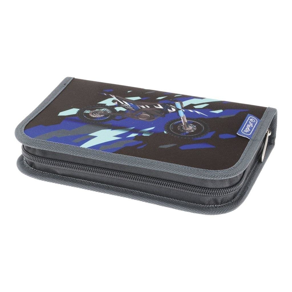 chlopně, motorka, 20,3 x 14 x 3,5 cm, 31 dílů - 14 fixů, 8 šestihranných pastelek, 2 tužky, ořezávátko, guma, 16 cm pravítko, trojúhelník, kuličkové pero, rozvrh hodin, vizitka, materiál: polyester prečítať celé