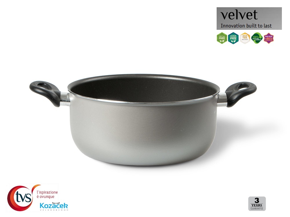 - nádobí z řady VELVET je vybaveno kvalitním vnitřním nepřilnavým dvouvrstvým povrchem IPERTEK z dílny italského výrobce TVS s.p.a.
