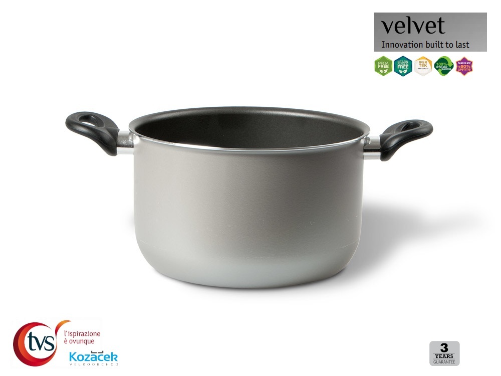 - nádobí z řady VELVET je vybaveno kvalitním vnitřním nepřilnavým dvouvrstvým povrchem IPERTEK z dílny italského výrobce TVS s.p.a.