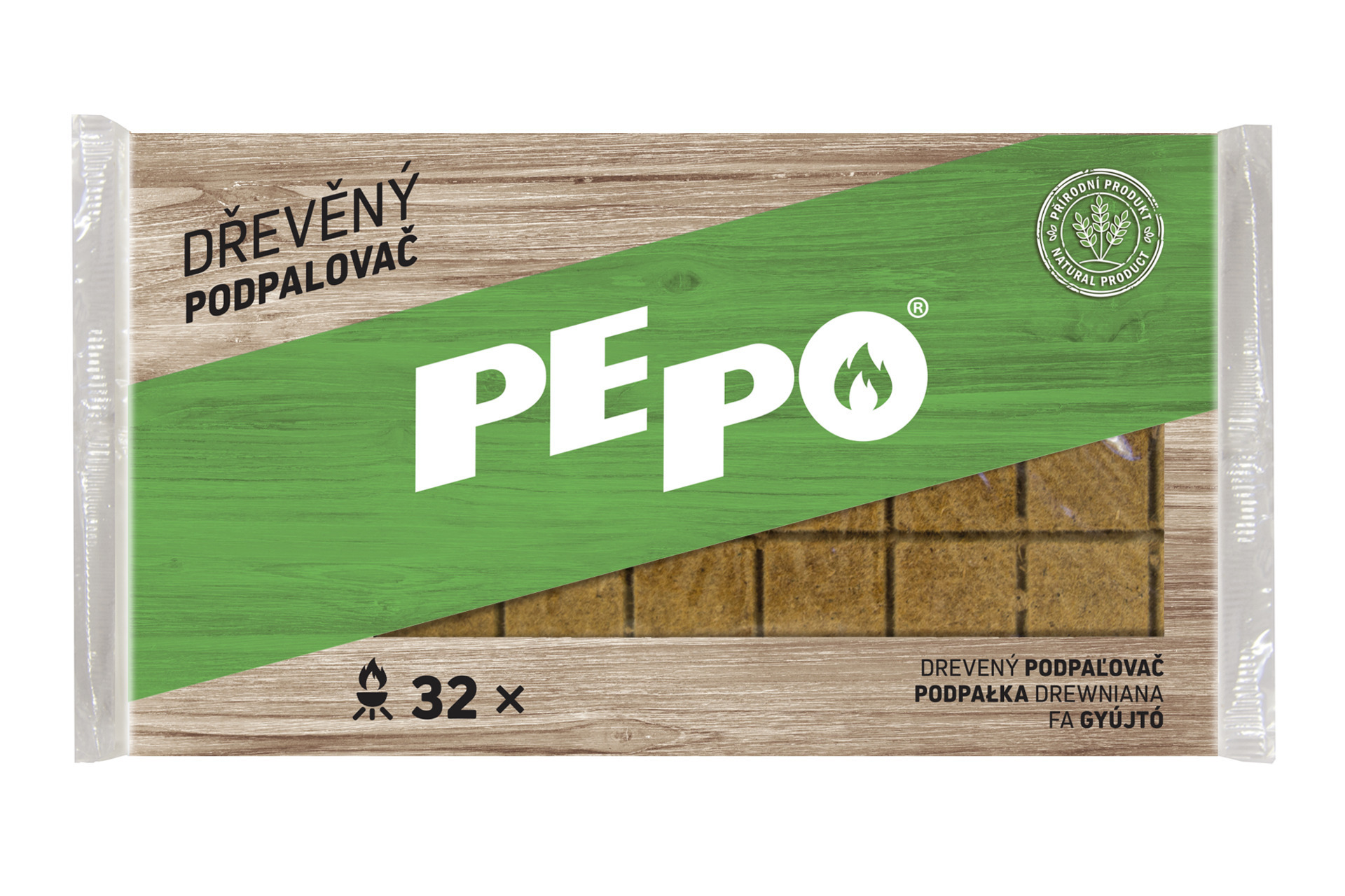 PE-PO dřevěný podpalovač, ve tvaru odlomitelných dílků, obsahuje pouze lisované dřevěné piliny a parafín. Zajímavá alternativa ke klasickým pevným či tekutým podpalovačům.