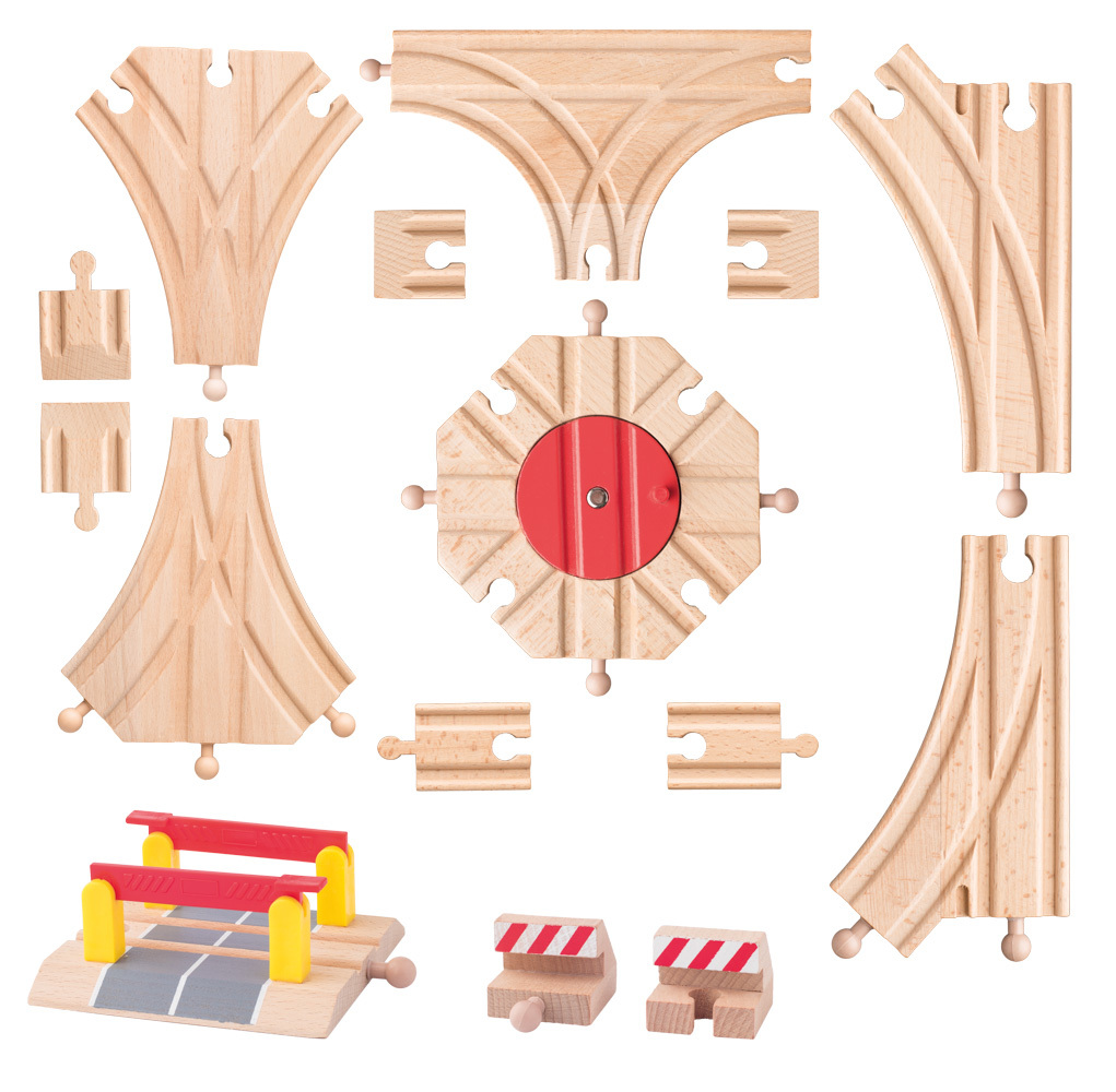 Příslušenství k vláčkodráze  - set kolejí, výhybky, točna, koncovky, přejezd se závorami. Díky této sadě můžete vymýšlet nové možnosti na trati. Koleje jsou vyrobeny z kvalitního dřeva a vynikají perfektním zpracováním. Věk: 3+. Rozměr produktu: 33,5 x 8 x 19 cm prečítať celé